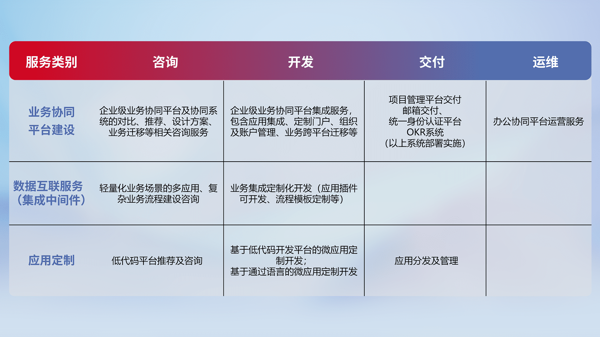 针对钉钉、、、、企微、、IDaas等平台级产品提供产品的规划、、方案、、交付、、定制化开发等服务,,,实现如统一协同办公、、智能客户服务、、、、混合会议管理、、、智能数据查询、、等业务场景,,,,实现数字化转型。。。